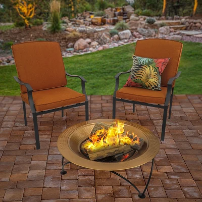 This low bowl fire pit is constructed of heavy gauge steel featuring a hammered texture, painted in a heat resistant copper finish. The bowl is seated in a wrought iron stand that provides a sturdy base and raises the fire up off ground surfaces. Included is a removable mesh spark screen cover and lifting tool that can double as a fire poker. Also included is a removable interior wood grate that allows ash to be easily cleaned out. This portable fire pit is perfect for adding both warmth and ambiance to outdoor gatherings.