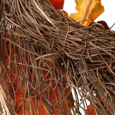 This wreath features assorted maple leaves in bright fall colors flowing from a woven branch base with individual twigs spread out from center. It is trimmed with orange gourds, pinecones, acorns and berry clusters for added natural appeal. Display this autumn accented wreath on doors, walls and windows in indoor or covered outdoor locations.