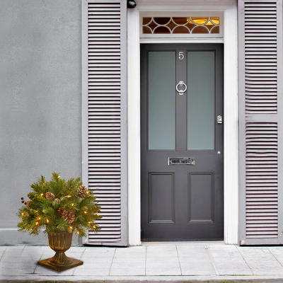 The Frosted Berry Porch Bush is an attractive and welcoming planting that will look right at home on porch, patio or doorway. This bush, seated in decorative urn base, is pre-strung with 35 clear lights that remain lit even if a bulb burns out. It is trimmed with red berries and frosted pine cones for added color. Display this stylish greenery in indoor or covered outdoor locations.